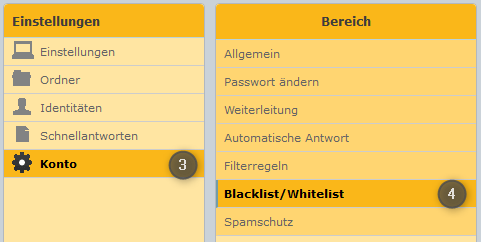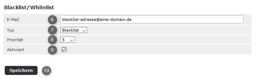 5. Bei einem „Blacklist“-Eintrag wird eine bestimmte E-Mail-Adresse explizit geblockt und nicht zugestellt, bei „Whitelist“-Eintrag wird eine E-Mail-Adresse explizit zugelassen und unabhängig von ihrem Spam-Level zugestellt.